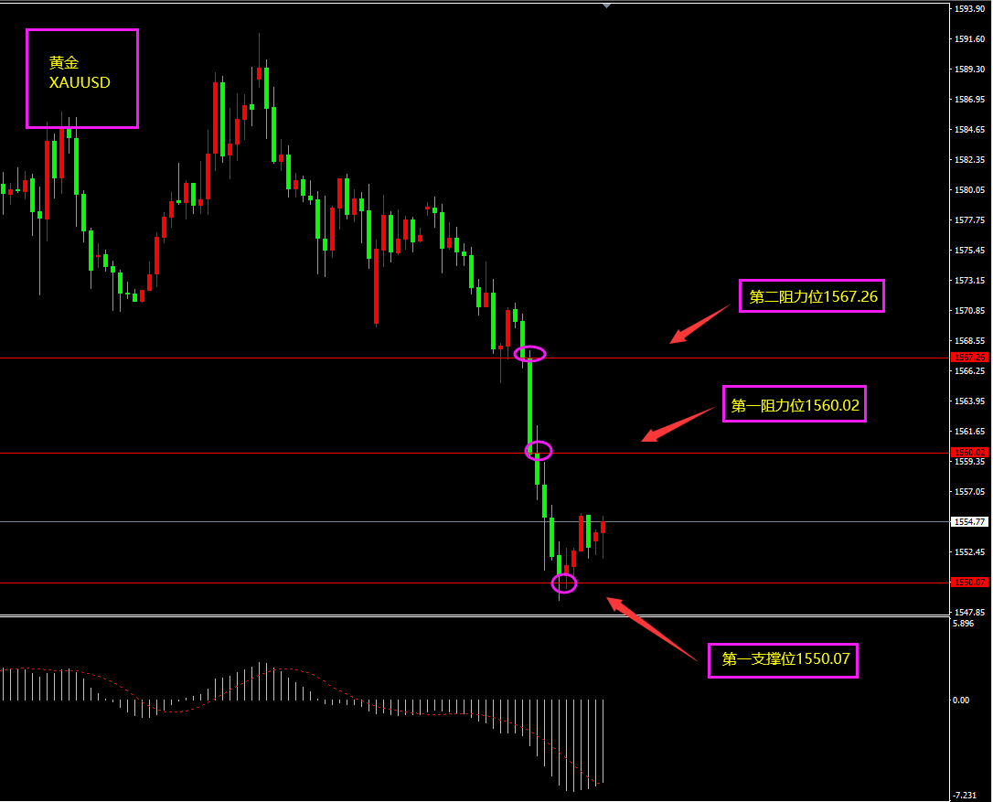 技术点评:天图黄金如期所料再次大幅回落,但大幅走弱后将是回调,此外避险降温促使黄金出现一波走弱,日内美指有望下行对黄金构成支撑,黄金日内更多以逢低看多为主。小时图黄金期间有连续打阴线下跌,MACD转移至0轴之下,空头为主,短期底部有连续阳线产生,能量体上移,且1550为整数关口,日内以逢低看多为主?