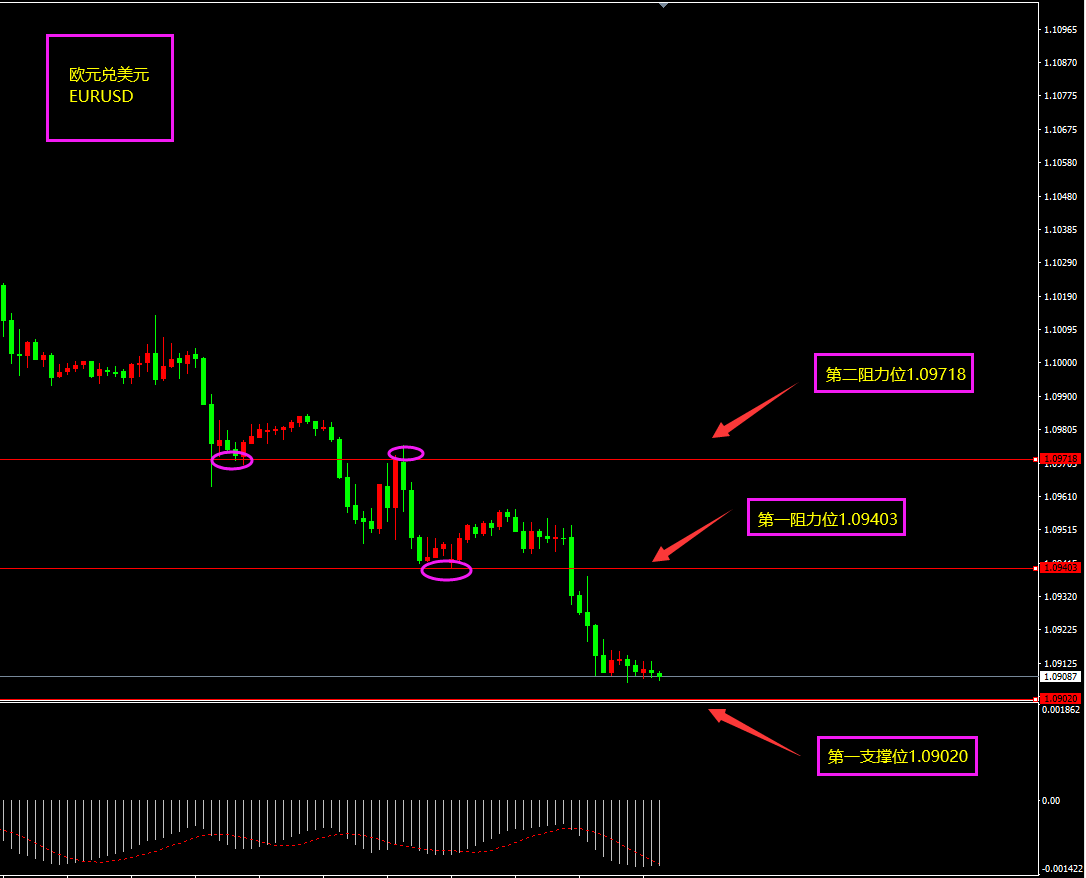 趋势分析:欧元近几日因美指冲高而受到打压。数据面利空欧元。