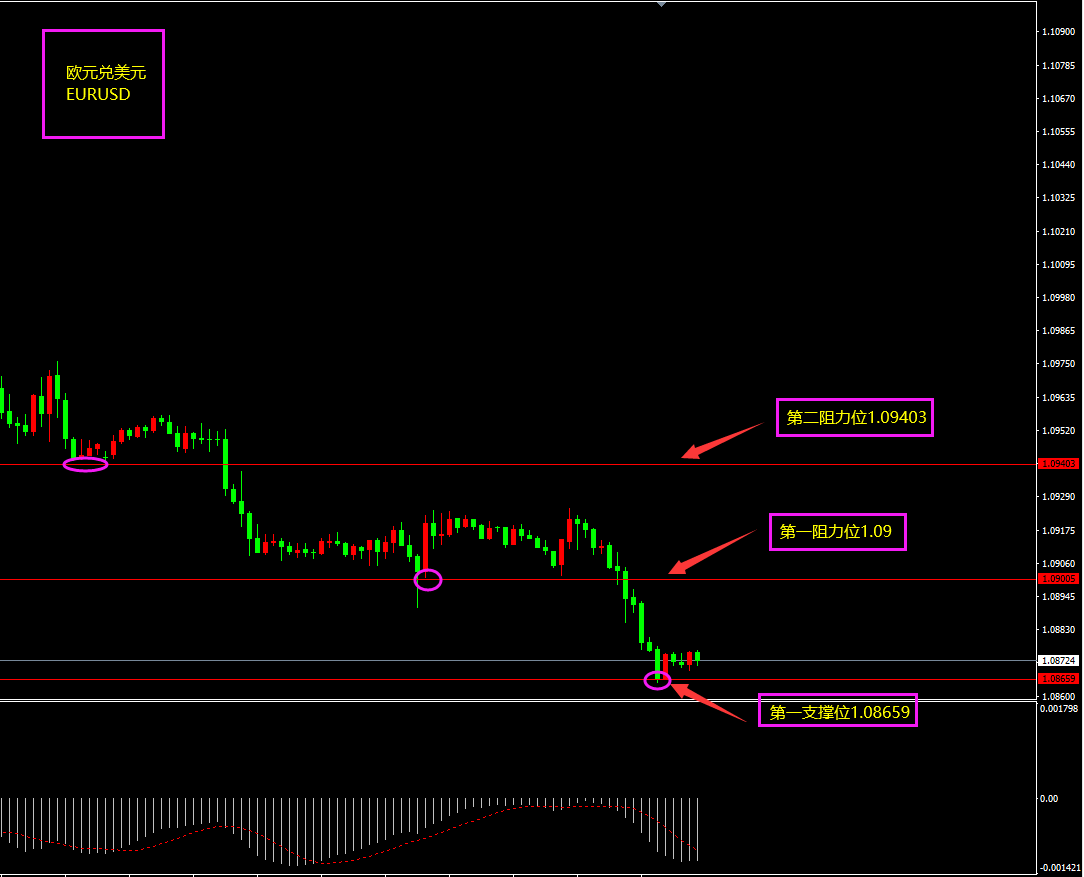 技术点评:天图欧元随着昨日晚间美指的冲高再次走弱,价格打破前期低位,近期欧元在整个非美货币中处于弱势货币,表现较弱,底部大阳线不出,多单不入。小时图欧元自MACD形成底背离之后,后续存在连续阴线下滑,MACD空头能量扩大,短期底部大阳线不出,多单不入,日内保持以震荡为主。