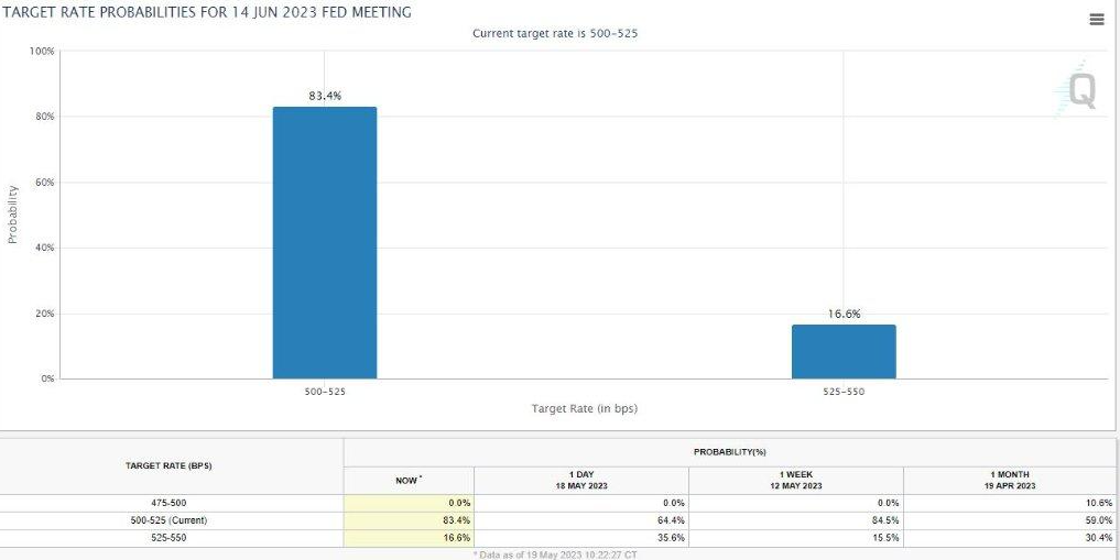 最新的美联储利率互换工具显示,交易员们下调FOMC在6月份加息的可能性至不足17%,暂不加息可能性升至83%。