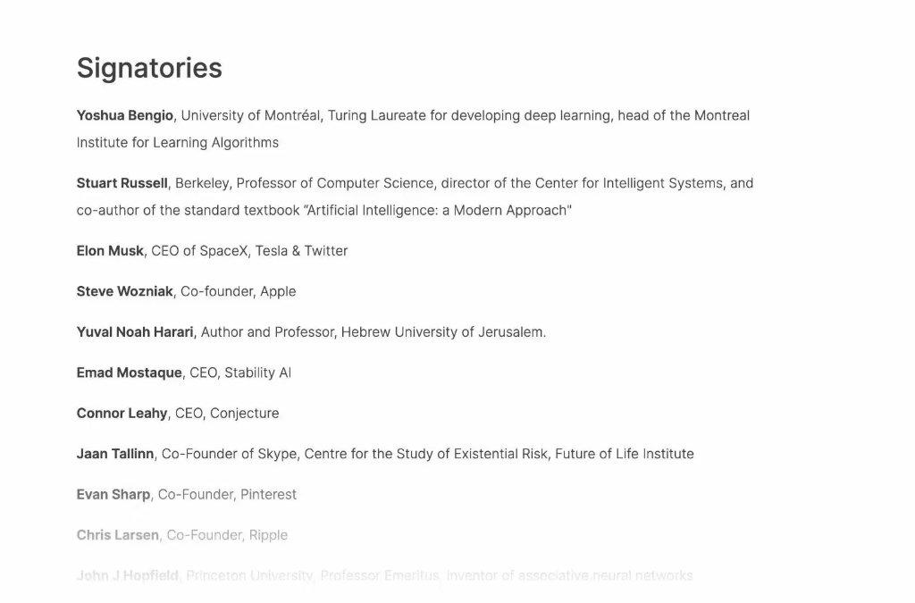 截至北京时间3月29日下午13时许,在该网站上,这封公开信获得了包括图灵奖得主Yoshua Bengio、马斯克、苹果联合创始人Steve Wozniak、Stability AI创始人Emad Mostaque等上千名科技大佬和AI专家已经签署公开信。