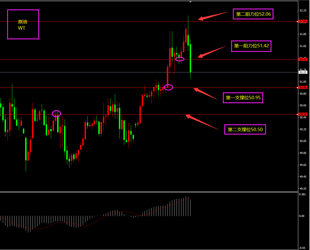 技术点评:天图原油从65跌至50,跌幅较大,昨日再次走出大阳线,验证底部多头依然存在,昨日库存大幅增加,阻碍原油反弹走势,日内更多在底部形成震荡?小时图原油期间价格直逼前高,上方存在阻力,且数据面利空,对原油形成打压,原油日内走势放缓,更多在高位形成震荡。