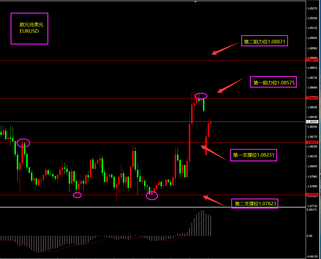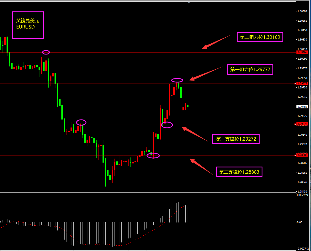 技术点评:天图英镑上周五收大阳线,因美指的高位回落以及英国数据利好促使英镑上涨,但需注意短期MAC仍位于0轴之下,空头占优,短期英国CPI虽有上涨,但仍处低位,存在降息可能,日内以看震荡为主。小时图英镑期间有连续阳线拉升,MACD位于0轴之上,多头占优,但上方为大阴线开盘价,阻力较大,日内以震荡为主。