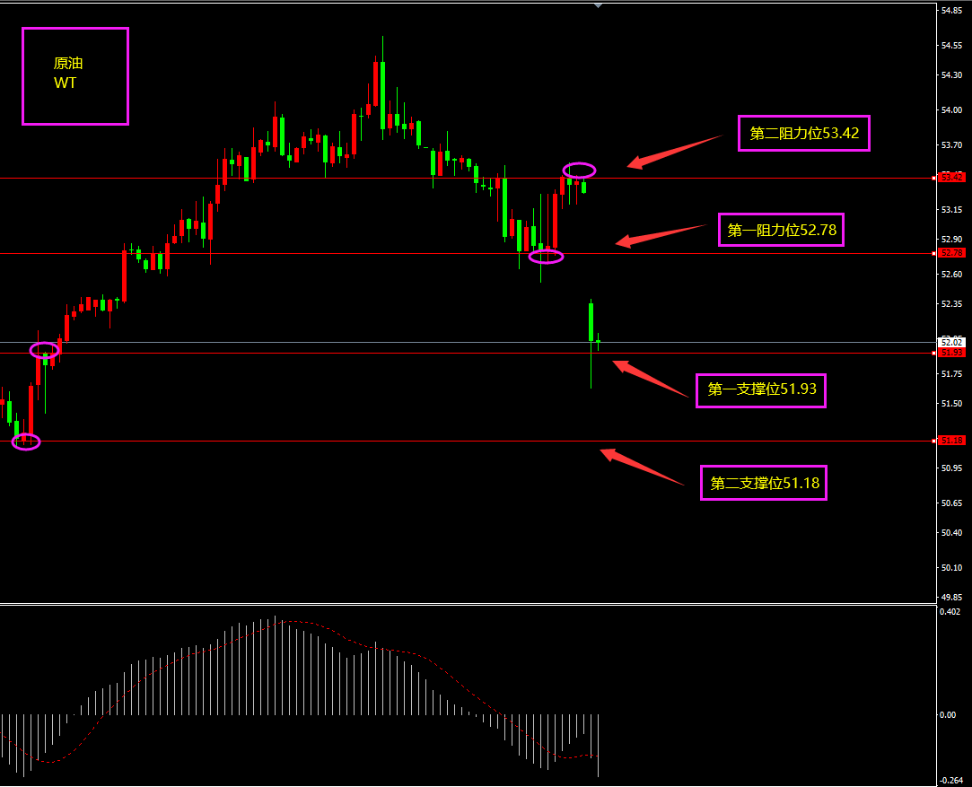 技术点评:天图原油自收长上影线之后,价格出现连续回落,上方为强阻力位,早间更是跳空低开低走,空头强势,日内继续保持逢高看空为主。小时图原油自上方顶背离之后,MACD快速回落至0轴之下,期间有大阴线产生,空头为主,日内以逢高看空为主?