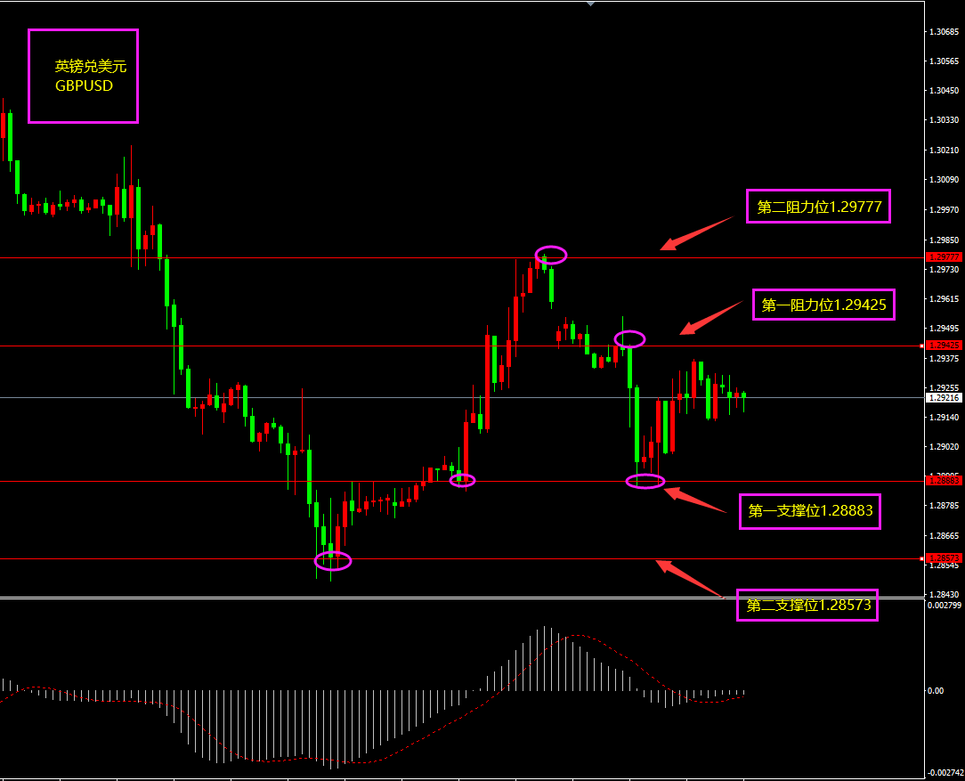 技术点评:天图英镑走出压缩三角形形态,近期将面临突破,而底部大阳线开盘价1.2877位置未被大阴线打破,随着昨日的技术回踩,收长下影线,底部买盘较大,日内更多以震荡以及震荡上行为主。小时图英镑多空相博,MACD转移至0轴附近,多空洗牌,方向面临选择,但结合天图大方向以及美元回落,日内以逢低看多为主。