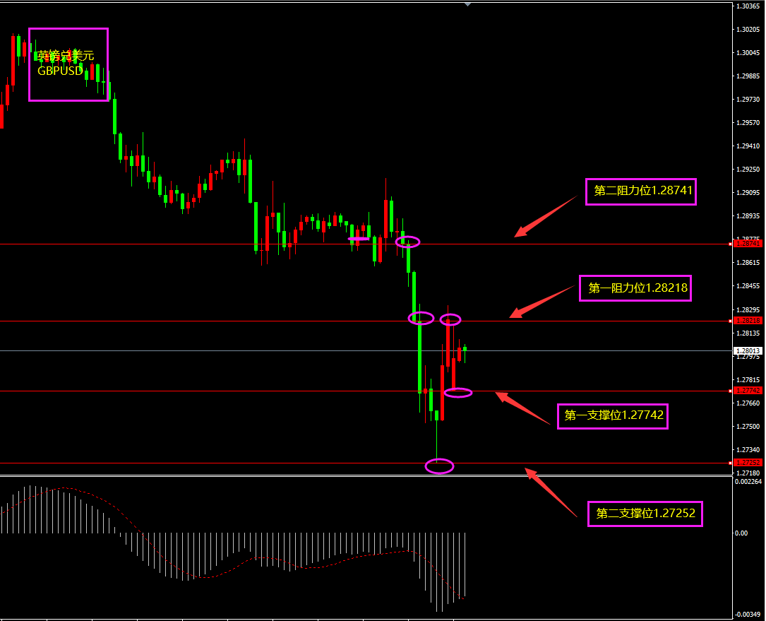技术点评:天图英镑走出压缩三角形形态,近期将面临突破,而近期在美元连续走弱的情况下出现下行,价格濒临三角形底部,日内将面临背水一战,站稳1.28,后续上涨,反之将出现暴跌。小时图英镑期间有连续大阴线下跌,价格创新低,但下方形成长下影,并有连续阳线拉升,是震荡的开始还是反弹的起步?支撑不破,看多不变。