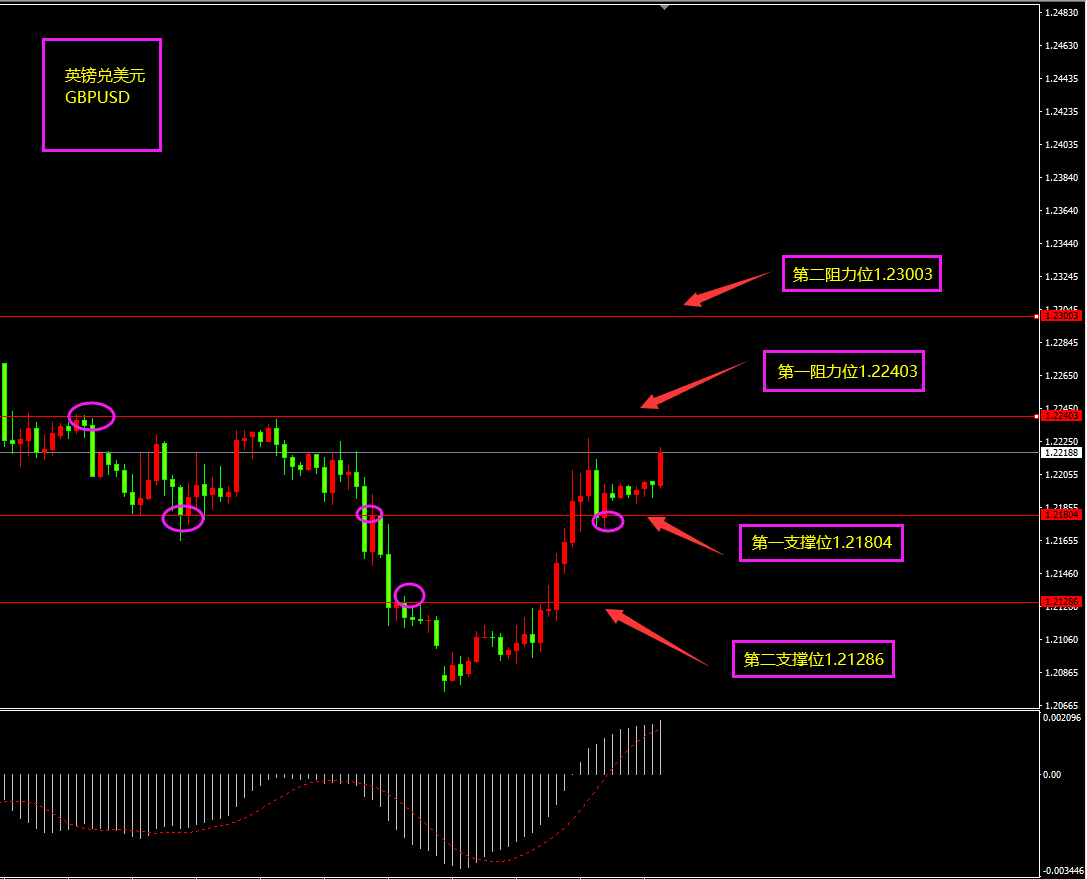 技术点评:天图英镑昨日收大阳线,因美指晚间暴跌利好英镑,短期大阴线开盘价未突破,空头仍在且MACD位于0轴之下,日内英镑更多以震荡为主。小时图英镑期间有连续阳线拉升,MACD转移至0轴之上,建立以多头为主,但大涨之后多头走势放缓,日内以偏震荡为主。